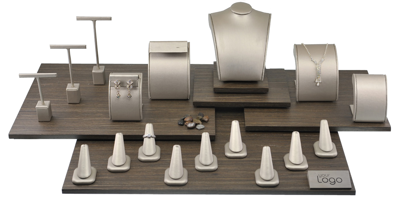 • Two foot jewelry display showcase solution - image featuring items in Paradiso Linea with Ebony Wood platforms. Set includes 22 elements for,